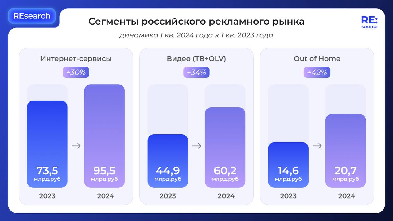 190 млрд рублей — объем рекламного рынка в России в январе — марте 2024 года