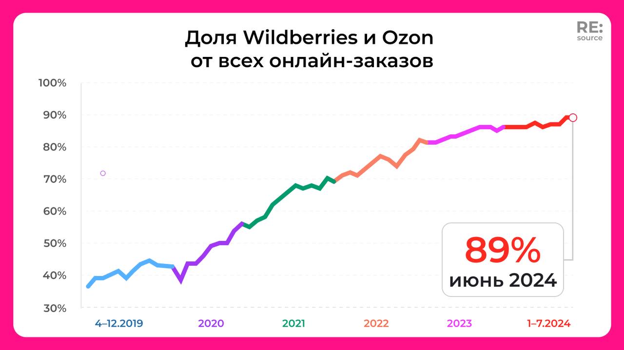 Это данные на октябрь 2024 года без учета кроссбордера и eGrocery. С 2019 года доля двух маркетплейсов увеличилась почти в два раза.