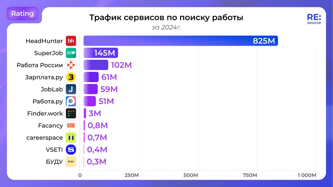 Трафик HeadHunter за 2024 год в 2 раза выше, чем у десяти его ближайших конкурентов вместе взятых