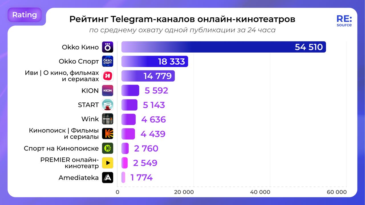 Каналы Кинопоиск и OKKO — абсолютные лидеры в Telegram среди онлайн-кинотеатров 🍿