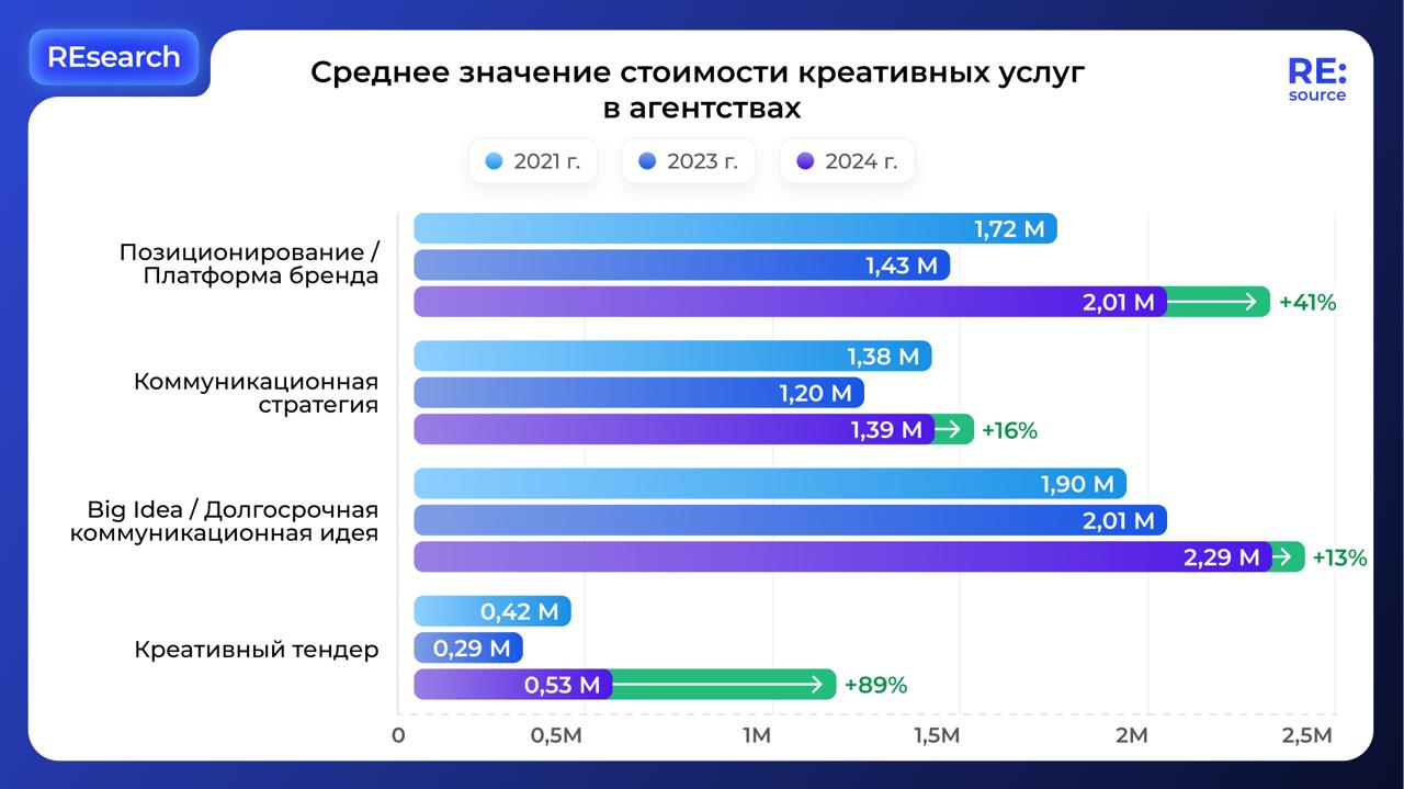 А самая высокобюджетная услуга — разработка Big Idea: в 2024 году она стоила 2,29 млн рублей.