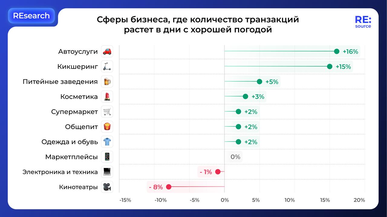 🚗Самой восприимчивой к изменениям погоды оказалась сфера автоуслуг — в солнечные летние дни количество транзакций увеличивается на 22%, а в дождь или снег — снижается.