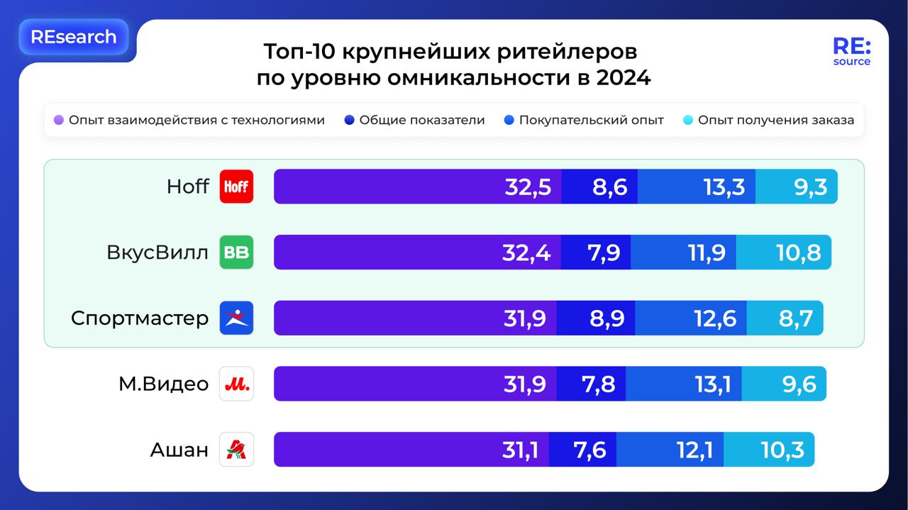 Лидирующую позиции занял Hoff — магазин товаров для дома. На втором месте — Вкусвилл, показавший лучший результат по опыту получения заказа. Закрывает тройку победителей Спортмастер с наилучшими оценками покупательского опыта.