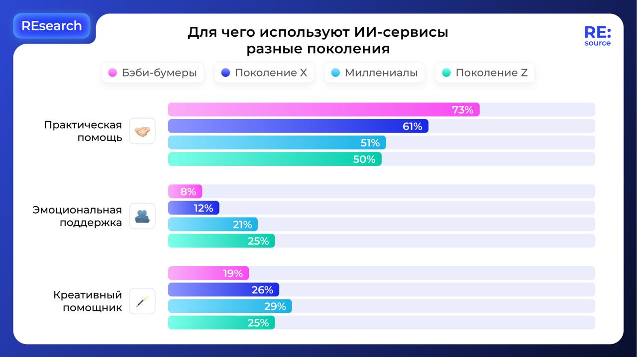 Интересно, что больше половины (73%) бумеров используют ИИ для практических целей — это самый высокий показатель относительно других поколений. А вот в качестве генератора креативных идей прибегают к нейросетям чаще остальных миллениалы.
