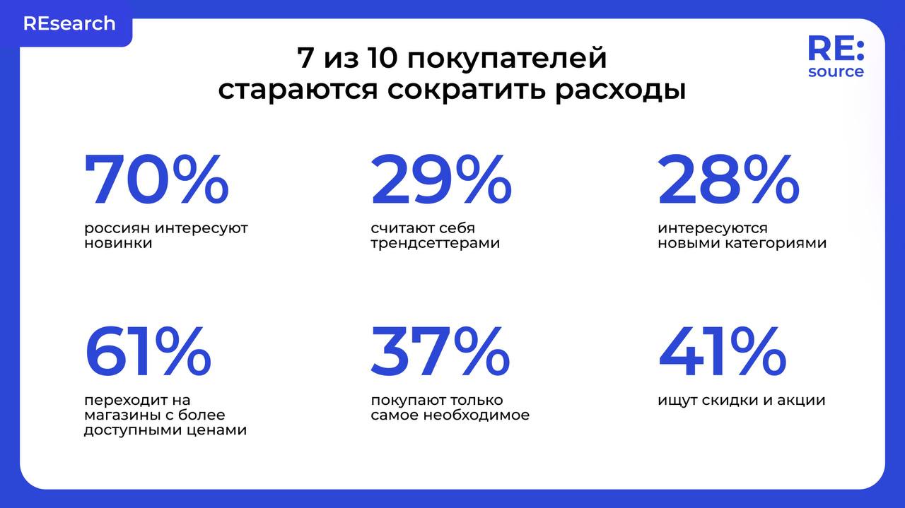🌀 Экономия — всё ещё главный тренд (да, это всерьёз и надолго). 7 из 10 покупателей стараются сократить расходы, а 37% покупают только самое необходимое. Не забывайте про акции и программы лояльности.