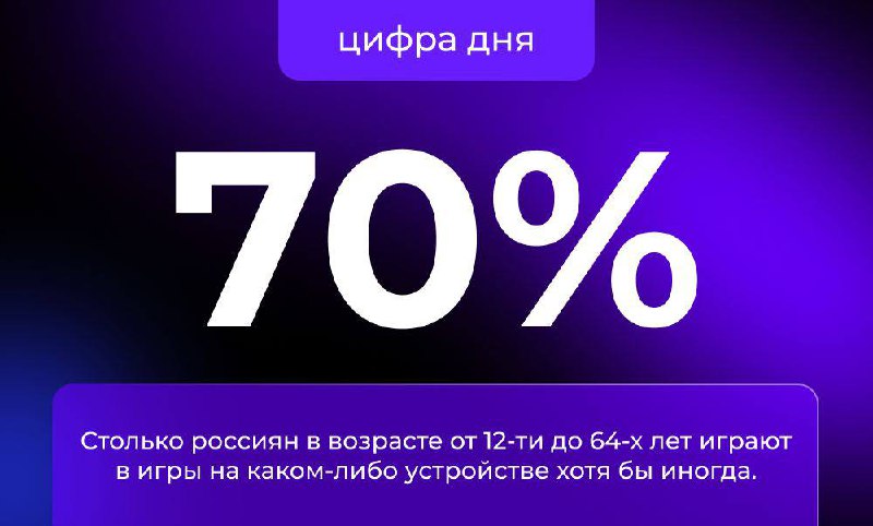 70% россиян в возрасте от 12-ти до 64-х лет играют в игры на каком-либо устройстве хотя бы иногда.