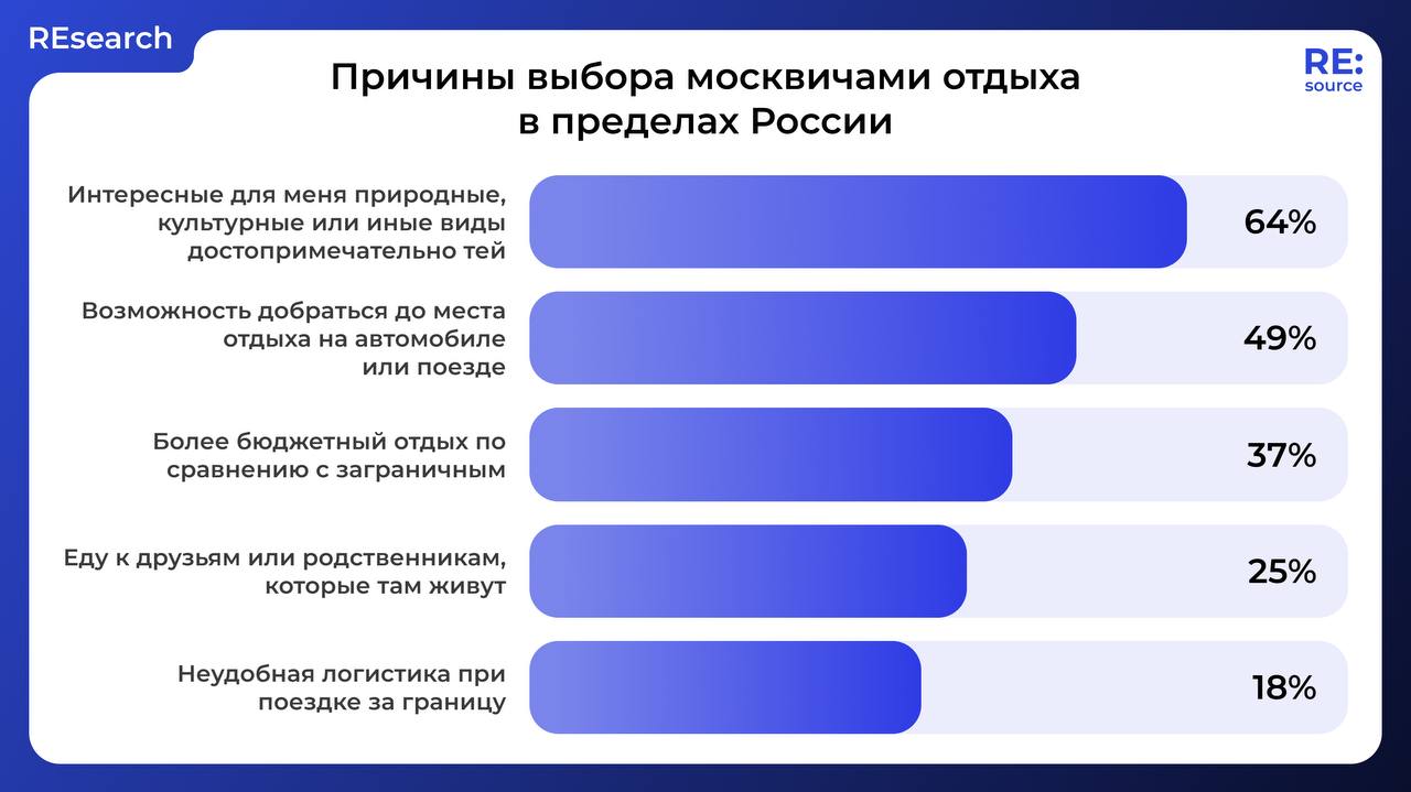 Интересные природные и культурные достопримечательности России являются причиной «номер один» для отдыха на родине. Немаловажным фактором для выбора направления оказалась возможность добраться до места назначения на машине. Кроме того, москвичи считают, что отдых в России бюджетнее, чем зарубежный.