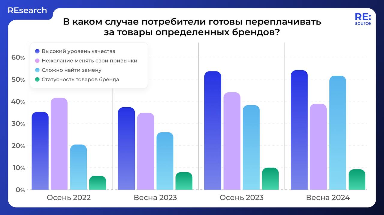 Интересно, что статусность бренда почти никогда не волновала покупателей в России. С 2022 по 2024 год ни разу не было ситуации, когда за статус готовы были переплатить более 10% россиян. Так, можно сделать вывод о том, что сейчас потребительские привычки россиян имеют именно рациональный характер.