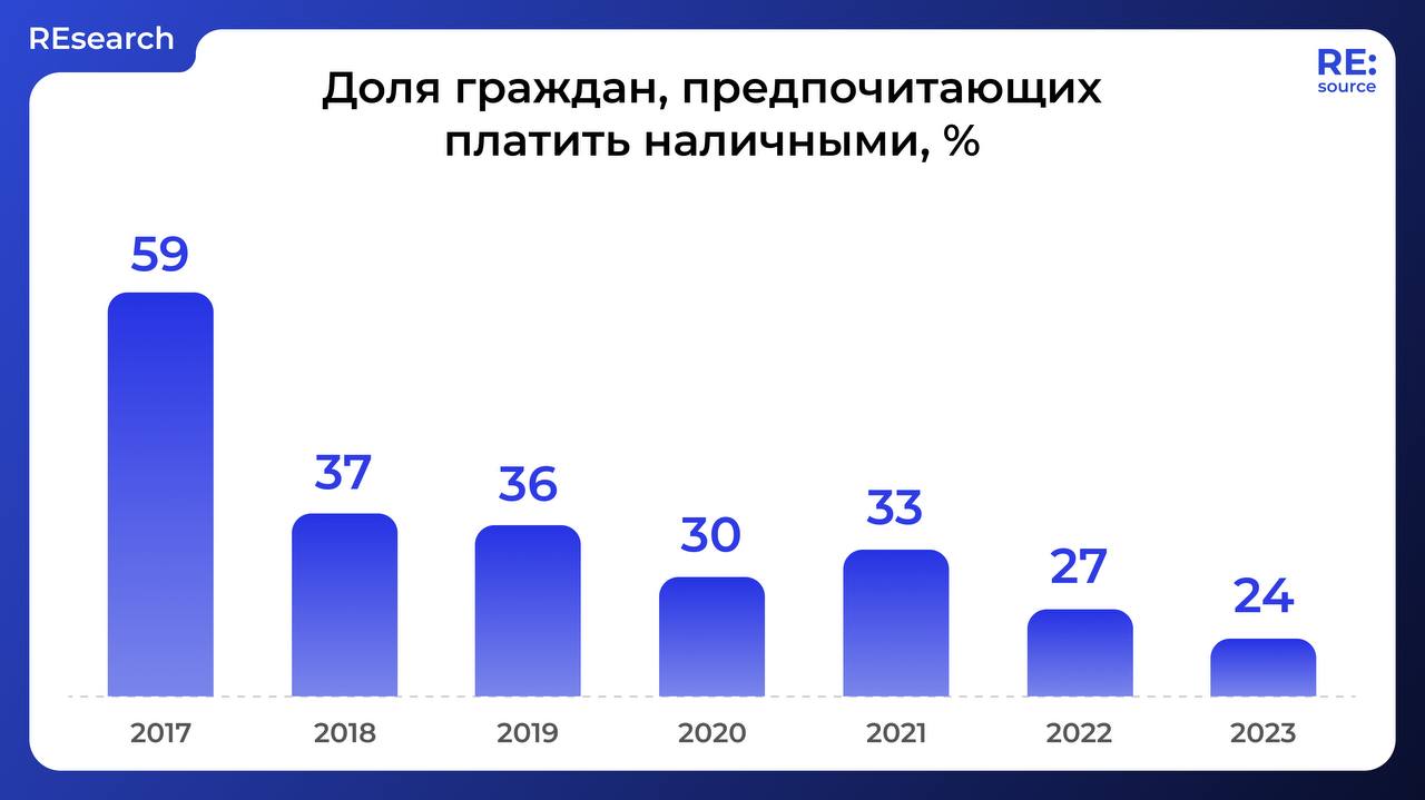 На самом деле, вопрос спорный. По данным на 2023 год, 24% граждан России из 46 регионов предпочитают оплачивать покупки именно наличными. Однако еще 7 лет назад (в 2017 году) наличным отдавали предпочтение вдвое больше россиян — 59%.